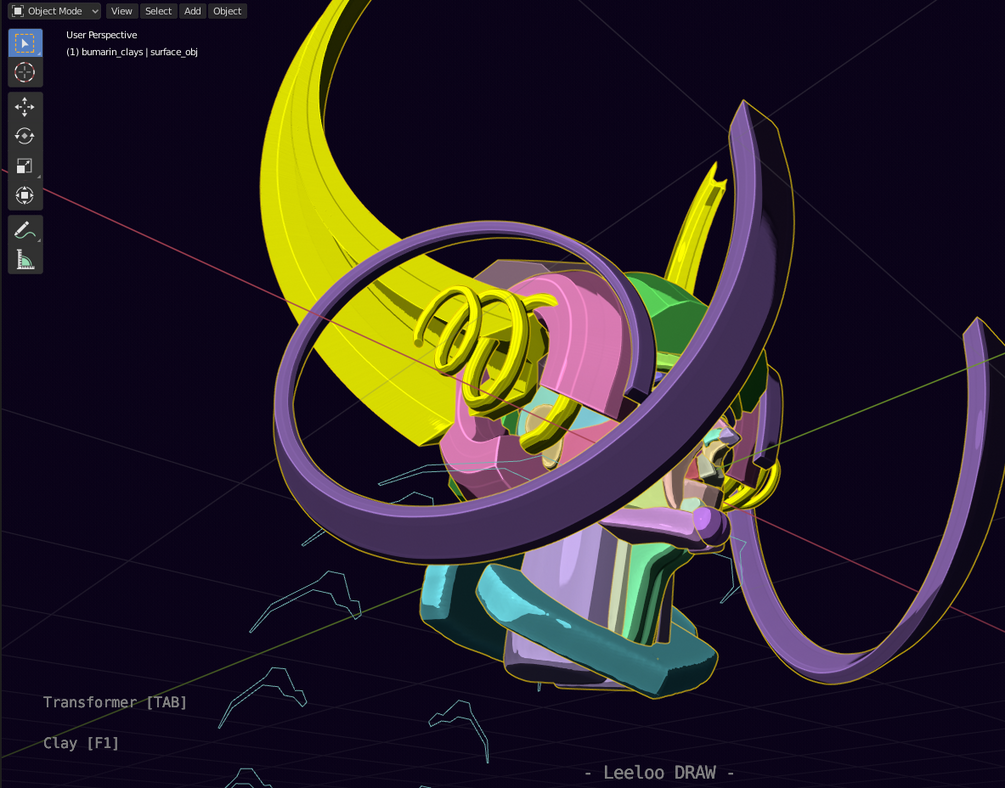 Bumarin is an environment in which the user draws 3D mesh thanks to the grease pencil. The initial idea is based on the approach of traditional sculpture that from a set of clay pieces generates a unified sculpture. Bumarin thus proposes 7 pencils allowing to generate 3D pieces of clay, each pencil having its own specificity.